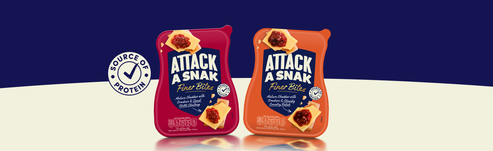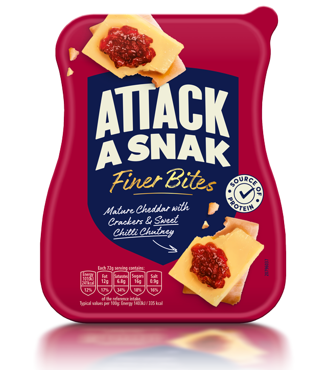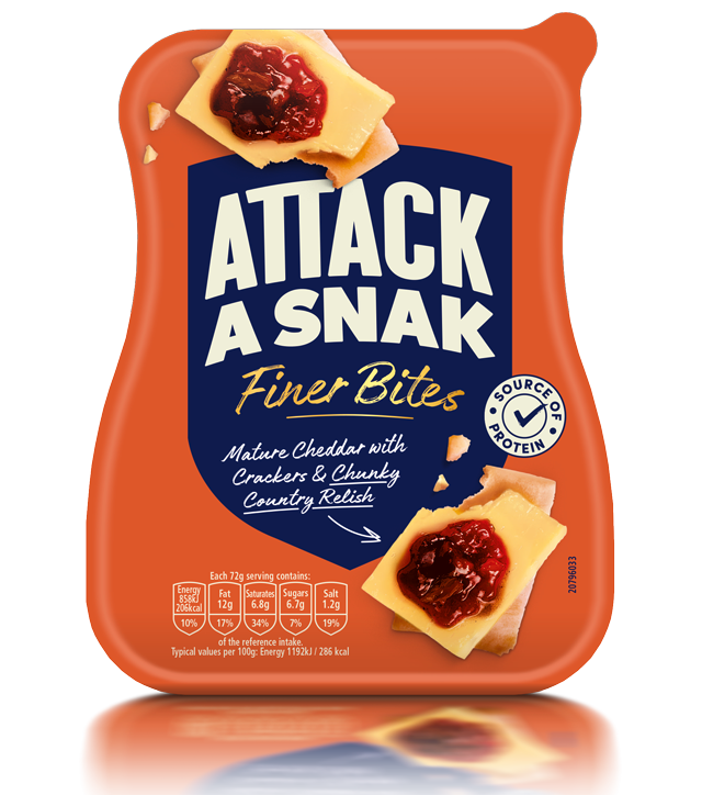 A Finer Bite from Attack A Snak – Mature Cheddar with Crackers and Chunky Country Relish. Each pack includes rich Mature Cheddar slices, crispy crackers, and a portion of Chunky Country Relish.